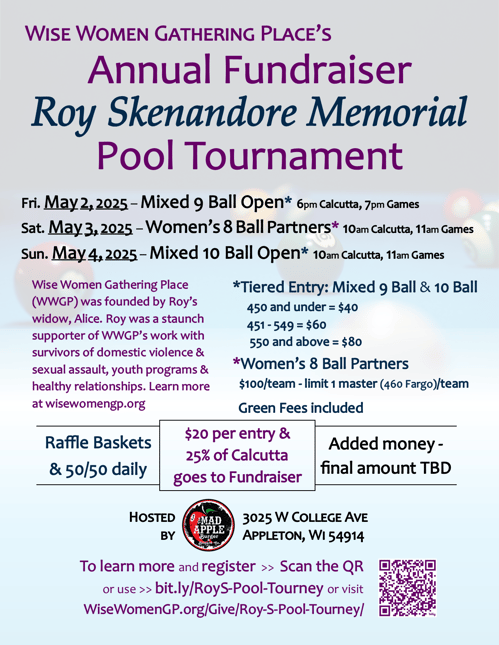 Each tournament is limited to one bracket. You can register the day of the tournament if there are open spots. You can also let us know you're coming by calling Brenda at 920-309-8154 or emailing bjohn@wisewomengp.org to put you name on the list. Please plan to arrive early to pay the entry fees.